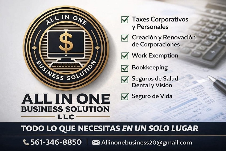 La imagen muestra una tarjeta promocional de la empresa All in One Business Solution LLC, que ofrece múltiples servicios empresariales y financieros en un solo lugar.